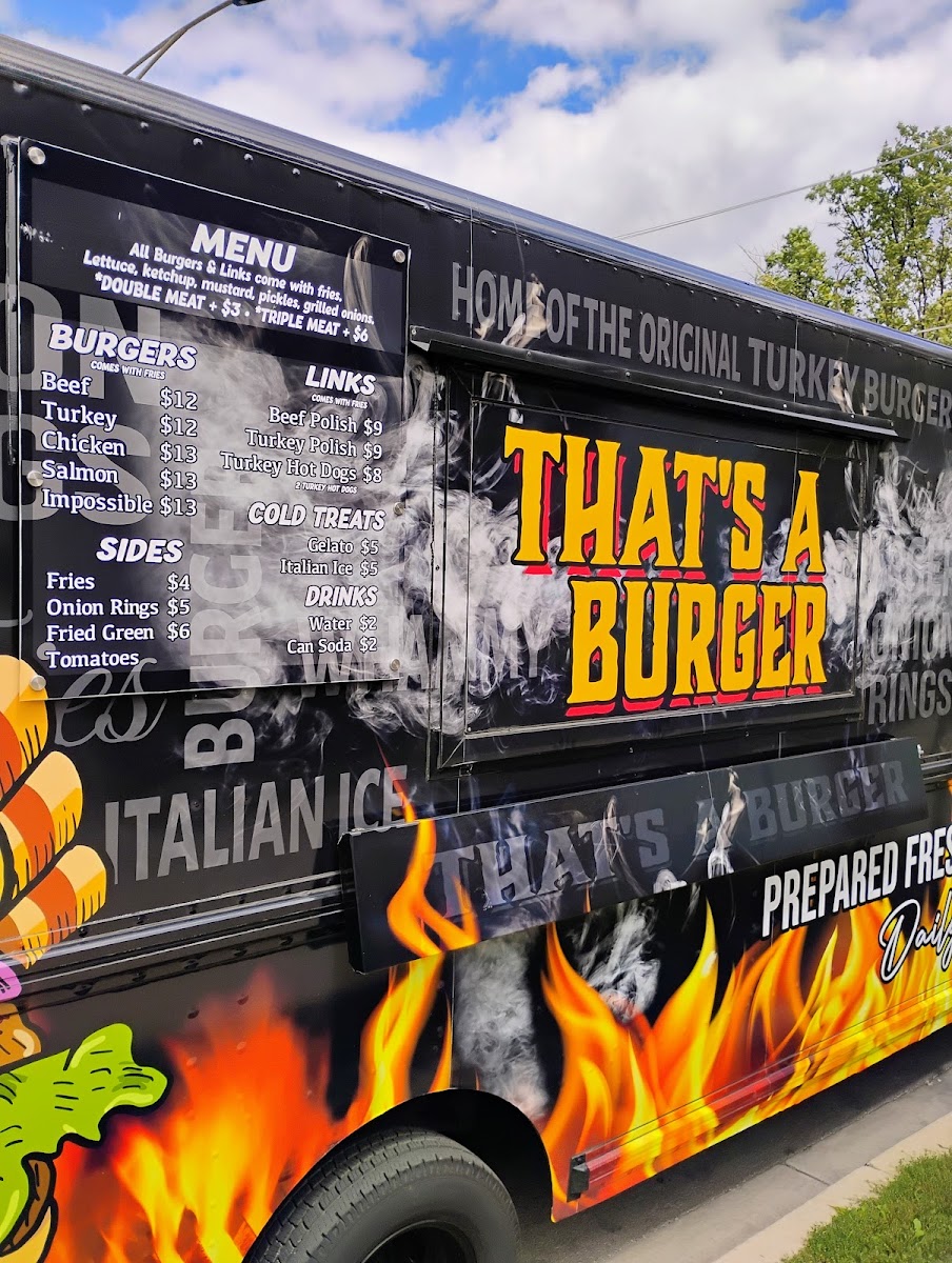 That's A Burger, located at 8301 S Stony Island Ave in Chicago, offers a diverse and flavorful menu that promises something for every type of diner. Starting with their Burgers, the restaurant serves a variety of options, including the Turkey Burger, Beef Burger, Chicken Burger, Salmon Burger, and the popular Impossible Burger for those seeking a veggie option. The prices for these burgers are not explicitly mentioned, but each of these is crafted to provide a satisfying meal.