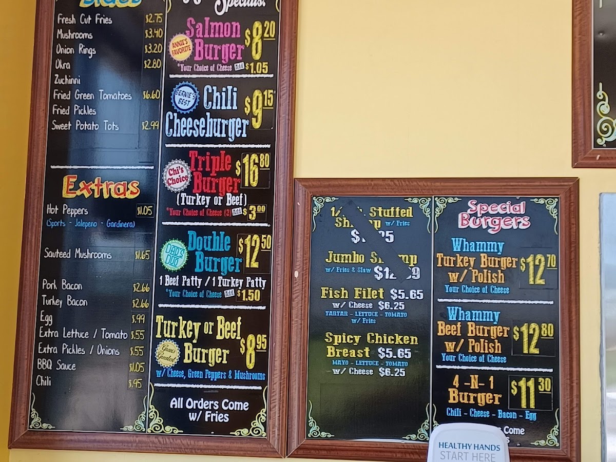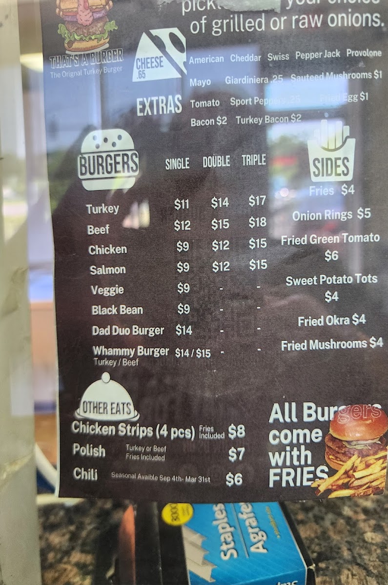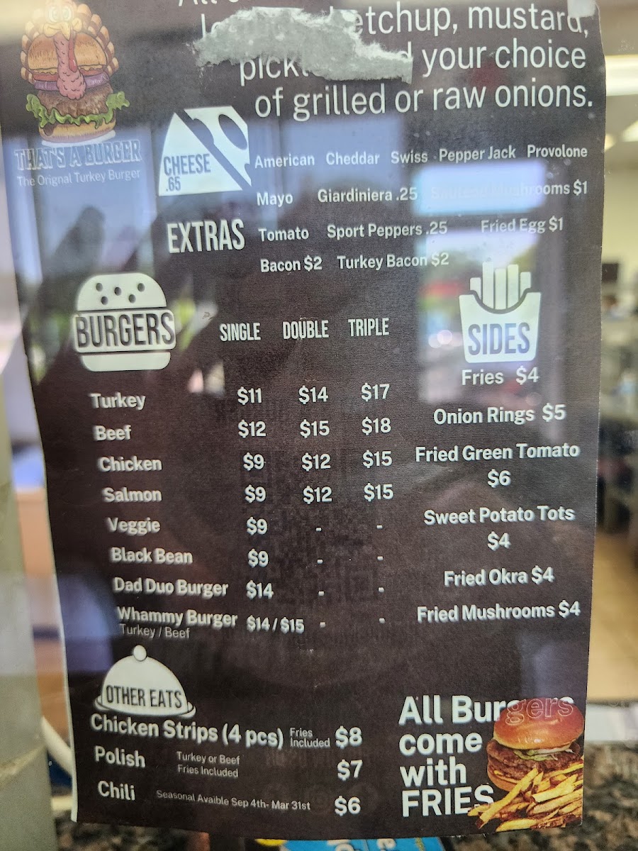 For Sides, That's A Burger has a tempting assortment, including Skin-On Fries, Onion Rings, Fried Green Tomatoes, and Sweet Potato Fries. If you're craving something heartier, the Turkey Chili is a perfect choice to complement your meal.